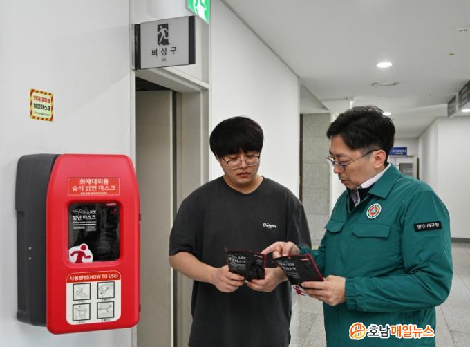 ¹æ¿¬¸¶½ºÅ©´Â À¯Çذ¡½º¸¦ ÈíÂøÇÏ°í ¼öºÐ º¸È£¸·À» Çü¼ºÇØ ¶ß°Å¿î ¿ÀÌ Æó·Î À¯ÀԵǴ °ÍÀ» ¹æÁöÇÑ´Ù. ¶Ç ¾à 15ºÐ µ¿¾È È£Èí±â¸¦ º¸È£ÇÏ¸ç ´ëÇÇ ½Ã°£À» È®º¸ÇØ ÈÀç·Î ÀÎÇÑ ÀθíÇÇÇØ¸¦ ÃÖ¼ÒÈÇÒ ¼ö ÀÖ´Â ¾ÈÀüÀåÄ¡ÀÌ´Ù. ¼±¸´Â Á÷¿ø ¹× ¹Î¿øÀεéÀÇ ¾ÈÀüÀ» ÇÑÃþ ´õ °ÈÇϱâ À§ÇØ ¹æ¿¬¸¶½ºÅ© 150°³¸¦ ºñÄ¡Çß´Ù.