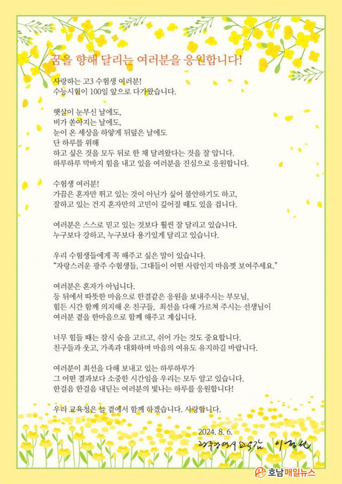 ÀÌ ±³À°°¨Àº ¼Çѹ®¿¡¼ ¡°ÀÚ¶û½º·¯¿î ±¤ÁÖ ¼öÇè»ýµé, ±×´ëµéÀÌ ¾î¶² »ç¶÷ÀÎÁö ¸¶À½²¯ º¸¿©ÁÖ¶ó¡±¸ç ¡°¿©·¯ºÐµé °ç¿¡´Â ºÎ¸ð´Ô, Ä£±¸µé, ¼±»ý´Ôµé, ±¤ÁÖ±³À°°¡Á· ¸ðµÎ°¡ ÇѸ¶À½À¸·Î ÇÔ²²Çϰí ÀÖÀ¸´Ï ¼ö´É½ÃÇèÀÌ ³¡³ª´Â ¼ø°£±îÁö ÃÖ¼±À» ´ÙÇØ Áֱ⠹ٶõ´Ù¡±°í ¹àÇû´Ù. ÀÌ¾î ¡°ÇѰÉÀ½ ÇѰÉÀ½ ³»µó´Â ¼öÇè»ýÀÇ ºû³ª´Â ÇϷ縦 ÀÀ¿øÇÑ´Ù¡±°í ÀüÇß´Ù.