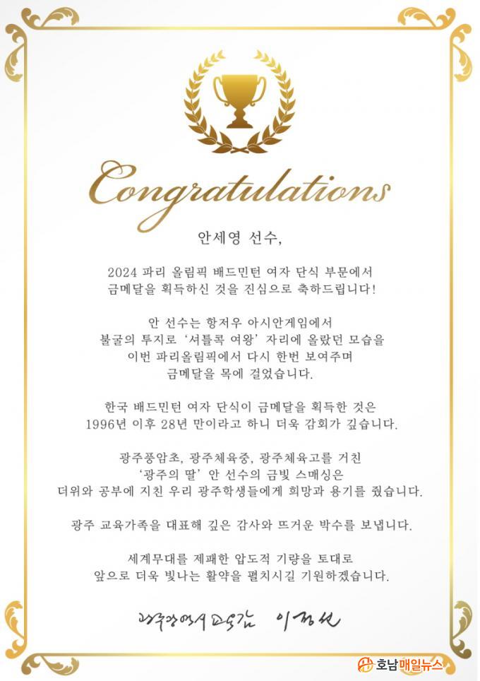 ÀÌ¾î ¡°¡®±¤ÁÖÀÇ µþ¡¯ ¾È ¼±¼öÀÇ ¡®±Ýºû ½º¸Å½Ì¡¯Àº ´õÀ§¿Í °øºÎ¿¡ ÁöÄ£ ¿ì¸® ±¤ÁÖÇлýµé¿¡°Ô Èñ¸Á°ú ¿ë±â¸¦ Áá´Ù¡±¸ç ¡°±¤ÁÖ ±³À°°¡Á·À» ´ëÇ¥ÇØ ±íÀº °¨»ç¿Í ¶ß°Å¿î ¹Ú¼ö¸¦ º¸³½´Ù¡±°í °Ý·ÁÇß´Ù.