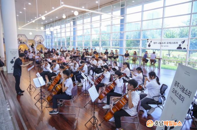 ±¤ÁÖ±¤¿ª½Ã(½ÃÀå °±âÁ¤)´Â 6ÀÏ Á¡½É½Ã°£À» ÀÌ¿ëÇØ 1Ãþ ½Ã¹ÎȦ¿¡¼ Áö¿ª û¼Ò³âµé·Î ±¸¼ºµÈ ¡®±¤ÁÖ ³ª´®¼Ò¸® ¿ÀÄɽºÆ®¶ó¡¯°¡ ÀÛÀº À½¾Çȸ¸¦ ¿¾î ½ÃûÀ» ãÀº ½Ã¹Î°ú Á÷¿øµé¿¡°Ô ¾Æ¸§´Ù¿î ¼±À²À» ¼±»çÇß´Ù.