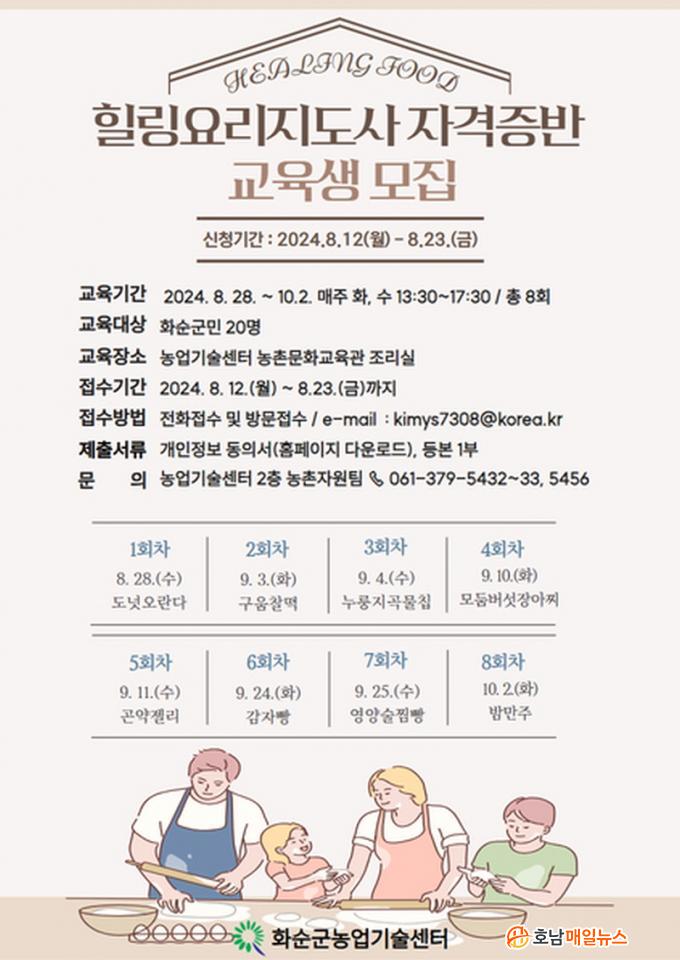 ½Åû ´ë»óÀº ȼø±º¿¡ ÁÖ¼ÒÁö¸¦ µÎ°í ÀÖÀ¸¸ç, Èú¸µ¿ä¸®¿Í ÀÚ°ÝÁõ Ãëµæ¿¡ °ü½ÉÀÌ ÀÖ´Â ±º¹ÎÀ¸·Î ¼±Âø¼ø 20¸íÀÌ´Ù. ÀÚ¼¼ÇÑ »çÇ×Àº ³ó¾÷±â¼ú¼¾ÅÍ È¨ÆäÀÌÁö¿¡¼ È®ÀÎÇÒ ¼ö ÀÖÀ¸¸ç ½Åû ¹æ¹ýÀº ¿À´Â 12ÀϺÎÅÍ È¼ø±º³ó¾÷±â¼ú¼¾ÅÍ ³óÃÌÀÚ¿øÆÀ(061-379-5433)À¸·Î ÀüÈ ½ÅûÇÏ¸é µÈ´Ù.