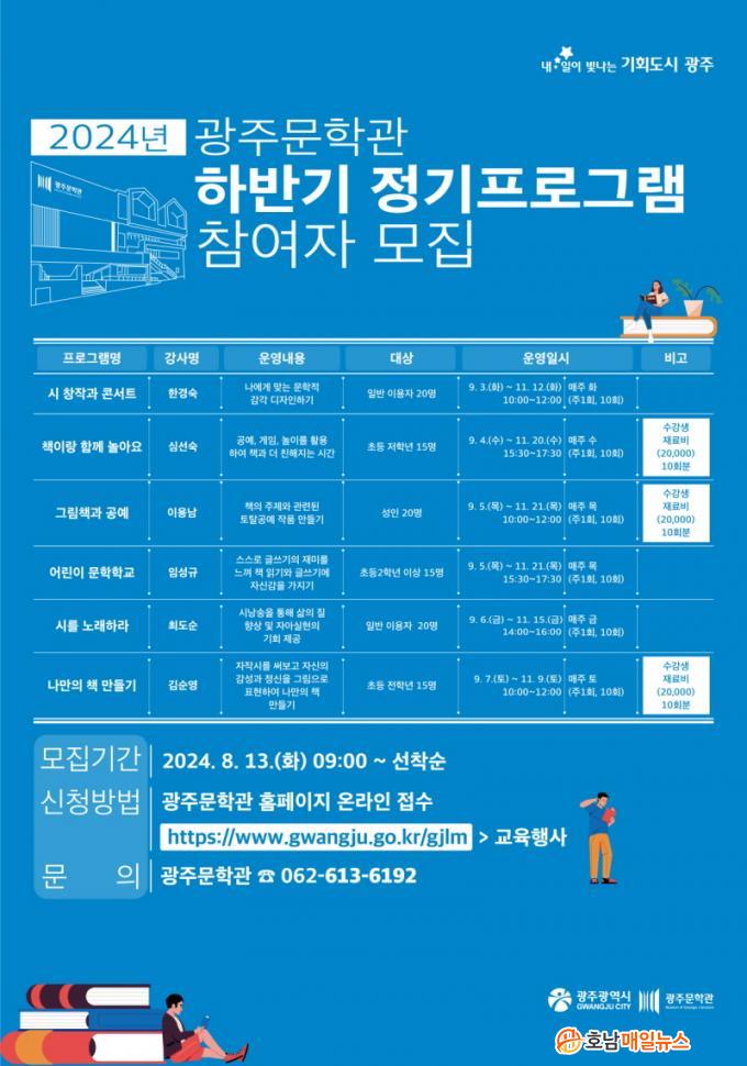 ÇÁ·Î±×·¥Àº °¢ 10Â÷½Ã·Î 9¿ùºÎÅÍ 11¿ù±îÁö ¿î¿µÇϸç, ¼ö°»ýÀº ÇÁ·Î±×·¥¿¡ ÇÊ¿äÇÑ Àç·áºñ¸¸ ºÎ´ãÇÏ¸é µÈ´Ù. ½ÅûÀº ±¤ÁÖ¹®Çаü ´©¸®Áý(https://www.gwangju.go.kr/gjlm)¿¡¼ ¿À´Â 13ÀÏ ¿ÀÀü 9½ÃºÎÅÍ ¼±Âø¼øÀ¸·Î Á¢¼öÇÑ´Ù.