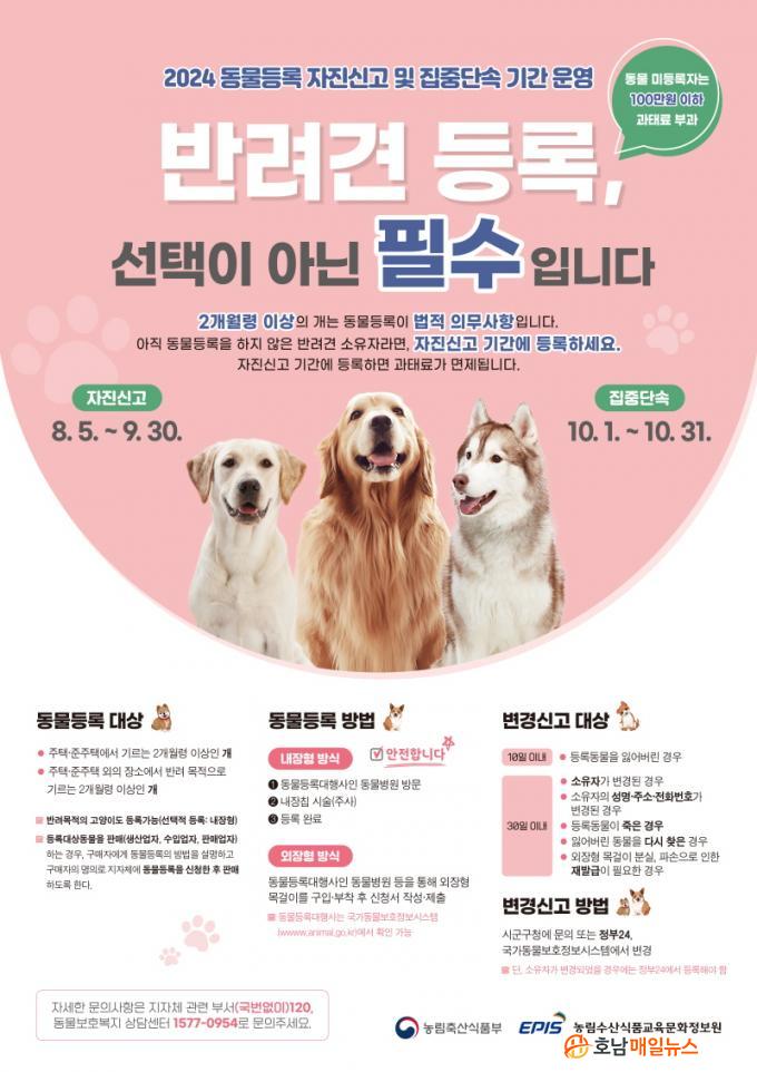 µ¿¹°µî·Ï º¯°æ½Å°í´Â ±¹°¡µ¿¹°º¸È£°ü¸®½Ã½ºÅÛÀ» ÅëÇØ ¿Â¶óÀÎÀ¸·Î °¡´ÉÇÏ¸ç µ¿¹°À» ÀÒ¾î¹ö¸± °æ¿ì¿¡´Â 10ÀÏ, Á¤º¸ º¯°æ½Ã(Á×Àº °æ¿ì Æ÷ÇÔ)¿¡´Â 30ÀÏ À̳»¿¡ ½Å°íÇØ¾ß ÇÑ´Ù. ÇÏÁö¸¸ ¼ÒÀ¯ÀÚ º¯°æ ½Å°í´Â ½ÃûÀ» Á÷Á¢ ¹æ¹®ÇØ¾ß ÇÑ´Ù.