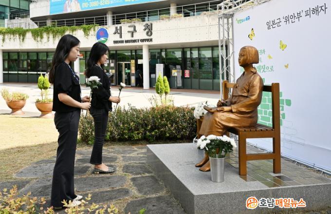 [È£³²¸ÅÀÏ´º½º = ±è¿¬Èñ ±âÀÚ] ±¤Áֽà ¼±¸(±¸Ã»Àå ±èÀ̰)´Â 8¿ù 14ÀÏ ÀϺ»±º 'À§¾ÈºÎ' ÇÇÇØÀÚ ±â¸²ÀÇ ³¯À» ¸Â¾Æ ¼±¸Ã» ±¤Àå 'ÆòÈÀÇ ¼Ò³à»ó' ¾Õ¿¡ ±â³ä°ø°£À» ¸¶·ÃÇØ ½Ã¹Î ´©±¸³ª À̳¯À» ±â¾ïÇϰí ÇåÈ.¹¬³äÇÒ ¼ö ÀÖµµ·Ï Çß´Ù.