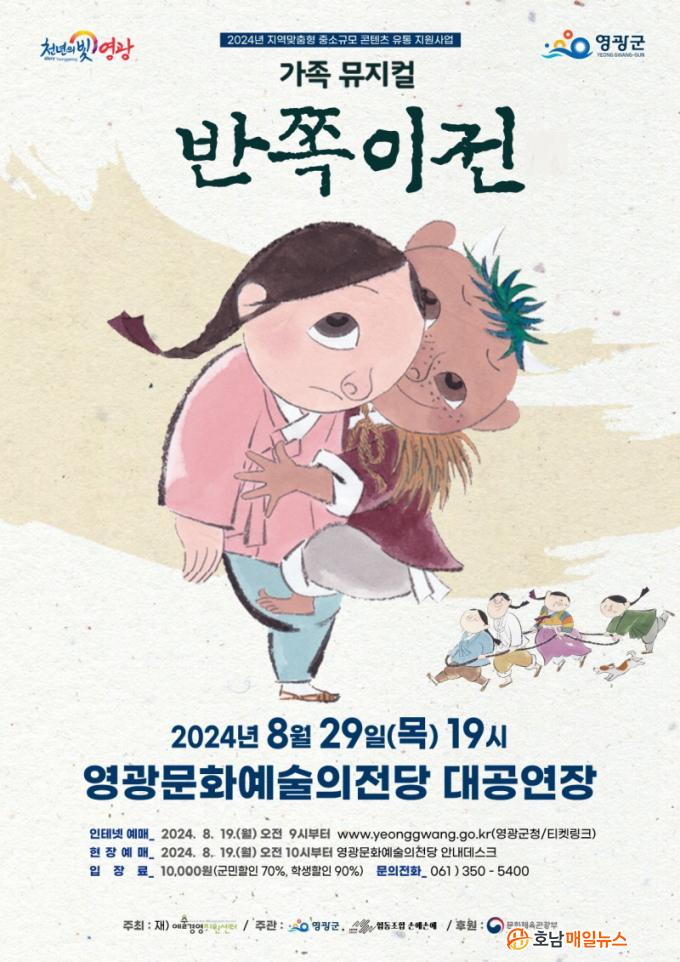 ¡®2024³â Áö¿ª¸ÂÃãÇü Áß¼Ò±Ô¸ð ÄÜÅÙÃ÷ À¯Åë Áö¿ø»ç¾÷¡¯¿¡ ¼±Á¤µÈ °ø¿¬À¸·Î ¿¹¼ú°æ¿µÁö¿ø¼¾ÅͰ¡ ÁÖÃÖÇϰí, ¿µ±¤±º°ú Çùµ¿Á¶ÇÕ ¼Õ¿¡¼Õ¿¡°¡ ÁÖ°ü, ¹®ÈüÀ°°ü±¤ºÎ°¡ ÈÄ¿øÇÑ´Ù. °ü¶÷·á´Â 10,000¿ø(¿µ±¤±º¹Î-3,000¿ø, Áß¡¤°íµîÇлý ÀÌÇÏ-1,000¿ø)À̸ç, ÀÔÀå±ÇÀº ¿À´Â 8¿ù 19ÀÏ(¿ù)ºÎÅÍ Æ¼ÄϸµÅ©¸¦ ÅëÇØ ÀÎÅÍ³Ý ¿¹¸Å¸¦ Çϰųª ¿µ±¤¹®È¿¹¼úÀÇÀü´ç ¾È³»µ¥½ºÅ©¿¡¼ ÇöÀ忹¸Å°¡ °¡´ÉÇÏ´Ù.