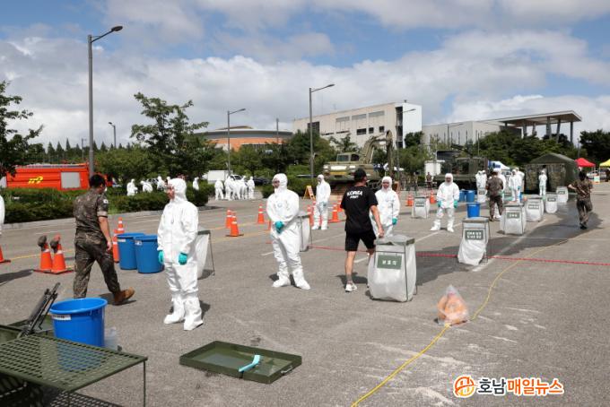 ÇöÀå¿¡´Â Á¦µ¶Â÷, Á¤ÂûÂ÷, ¹ö½º, ±¸±ÞÂ÷, ±¼»è±â, ¿¡¾îÅÙÆ®, ¹®Çü°èÃø±â, °³Àμ±·®°è µî 20¿© Á¾ÀÇ Àåºñ¸¦ µ¿¿øÇÏ¿© ½ÇÀüÀ» ¹æºÒÄÉ ÇÏ´Â Àåºñ·Î ÇÙ ¹× ´ë·®»ì»ó¹«±â(WMD) »çÈİü¸® ¿µ»ó½Ãû ¡ã¹æ»ç´É ÇÇÇØÀÚÀÇ ºÎ»óÁ¤µµ¿¡ µû¶ó ½Äº°ÇÏ¿© ÇÇÇØÁֹο¡ ´ëÇÑ È¯ÀÚ ºÐ·ù¿Í Á¦¿° ¡ã±ä±Þóġ ¡ã¿À¿°¹°Áú ¸Å¸ô¡ãÀÎü ¹× À屸·ù Á¦¿°¿¡ ÇÊ¿äÇÑ ºñ´°¹°°ú ¹° Á¦°ø ¡ãÇǺ¹°ú Àåºñº¸±Þ ¡ãº´¿ø ÈÄ¼Û ¼øÀ¸·Î ÈÆ·ÃÀÌ ÁøÇàµÆ´Ù.