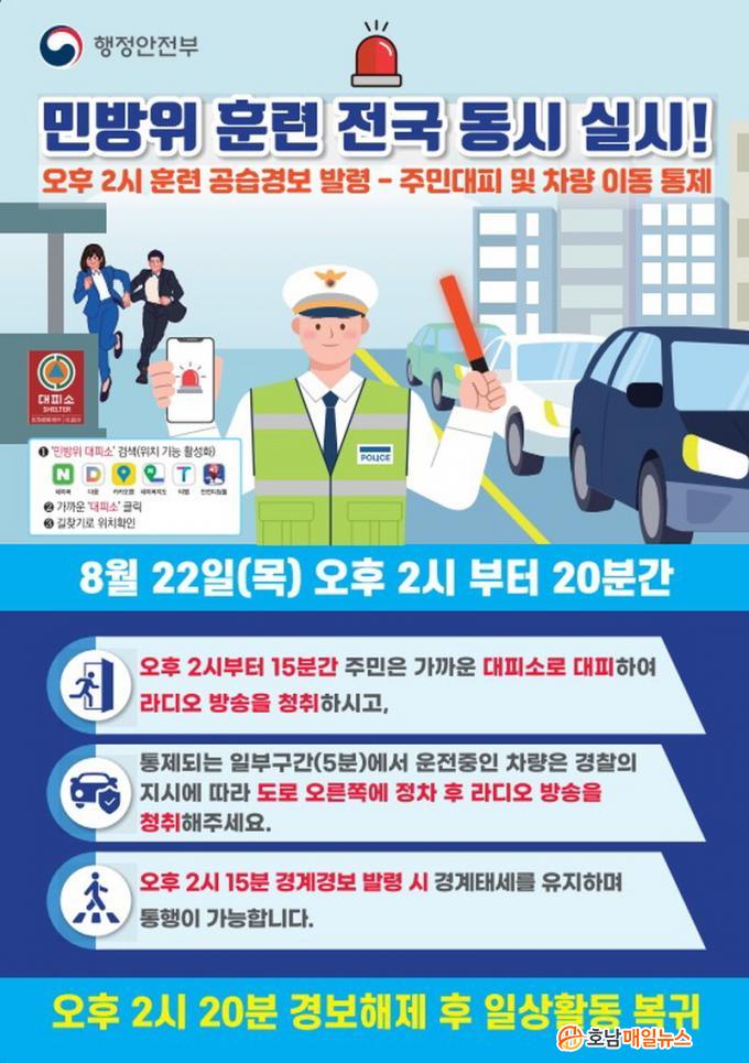 À̳¯ ÈÆ·ÃÀº ¡ã°ø½À°æº¸ ¹ß·É(¿ÀÈÄ 2½Ã), ¡ã°æ°è°æº¸ ¹ß·É(¿ÀÈÄ 2½Ã 15ºÐ) ¡ã°æº¸ ÇØÁ¦ (¿ÀÈÄ 2½Ã 20ºÐ)¼øÀ¸·Î ÁøÇàµÈ´Ù. °ø½À°æº¸°¡ ¹ß·ÉµÇ¸é ¡ã¸ðµç ½Ã¹ÎÀº ½Å¼ÓÇÏ°Ô °¡±î¿î ¹Î¹æÀ§ ´ëÇǼҷΠ´ëÇÇÇØ¾ß ÇÏ¸ç ¡ã¹Î¹æÀ§ ´ëÇǼÒÀÇ À§Ä¡´Â ¾ÈÀüµðµõµ¹ ¾Û, ±¹¹ÎÀç³¾ÈÀüÆ÷ÅÐ(www.safekorea.go.kr)¿¡¼ È®ÀÎÇÒ ¼ö ÀÖ´Ù.