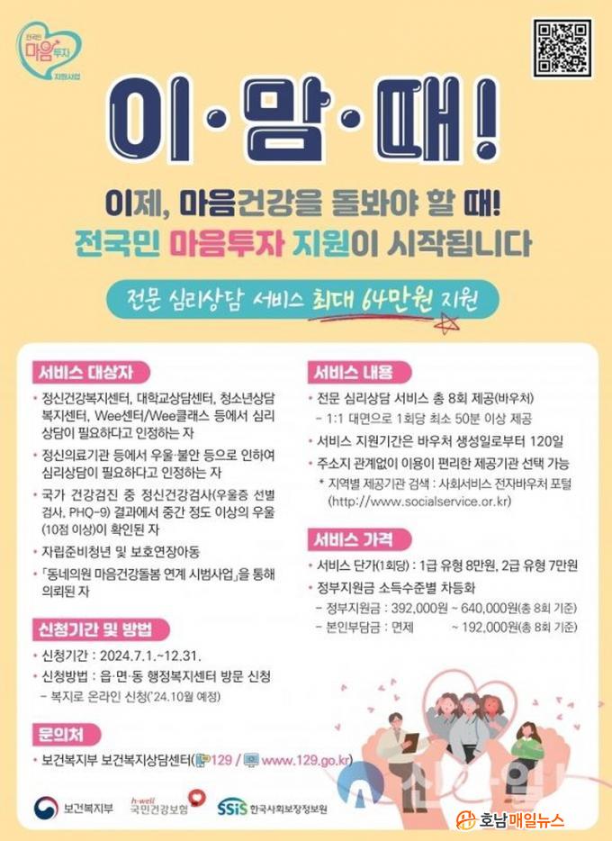 Áö¿ø ³»¿ëÀº 1:1 ´ë¸é Àü¹® ½É¸®»ó´ã ¼ºñ½º ¹Ù¿ìó(ÃÑ 8ȸ, ȸ´ç 50ºÐ ÀÌ»ó) Á¦°øÀ¸·Î 120ÀÏ À̳» »ç¿ëÇϰí, ȸ´ç »ó´ã ºñ¿ëÀº Á¦°ø ÀηÂÀÇ Àü¹®¼º°ú ¿ª·®¿¡ µû¶ó 1±Þ(8¸¸ ¿ø)°ú 2±Þ(7¸¸ ¿ø)À¸·Î ±¸ºÐÇϸç, º»Àκδã±ÝÀº ¼Òµæ ¼öÁØ¿¡ µû¶ó 0~30%±îÁö Â÷µî ºÎ°úµÈ´Ù.