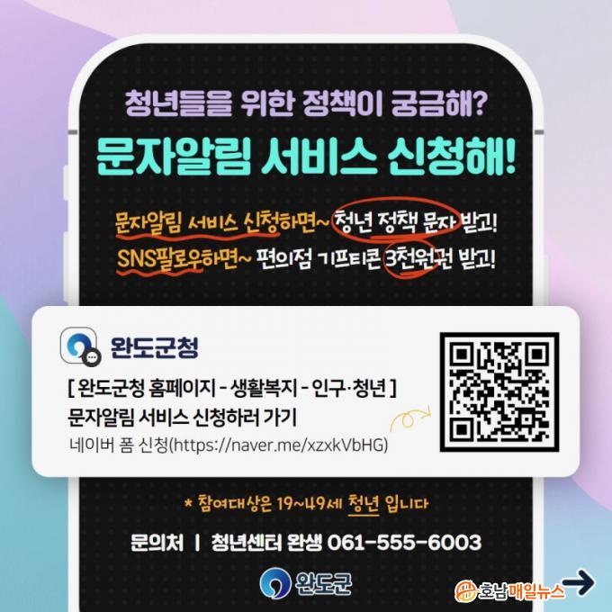 ¹®ÀÚ ¾Ë¸² ¼ºñ½º´Â Àü±¹ÀÇ 19~49¼¼ û³âµéÀ» ´ë»óÀ¸·Î Çϸç, ½ÅûÀº ¿Ïµµ±º ´©¸®Áý-»ýȰ º¹Áö-Àα¸ û³â-¹®ÀÚ ¾Ë¸² ¼ºñ½º â¿¡¼ ÇÏ¸é µÈ´Ù. 10¿ù 3ÀϱîÁö ¹®ÀÚ ¾Ë¸² ¼ºñ½º ½Åû ÈÄ ¿Ïµµ û³â¼¾ÅÍ ¿Ï»ý SNS(ÆäÀ̽ººÏ, ÀνºÅ¸)¸¦ ÆÈ·Î¿ìÇÏ¸é ±âÇÁƼÄÜÀ» Áö±ÞÇÏ´Â À̺¥Æ®µµ ÁøÇàÇÑ´Ù.