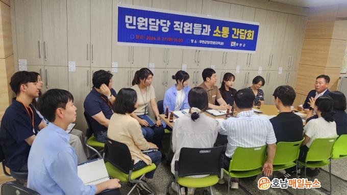 À̹ø °£´ãȸ´Â ÇàÁ¤ ÃÖÀϼ±¿¡¼ ¹Î¿ø ¼ºñ½º Çâ»ó°ú ±º¹Î ¸¸Á· ÇàÁ¤±¸ÇöÀ» À§ÇØ ³ë·ÂÇÏ´Â ¹Î¿ø½ÇÀ» Á÷Á¢ ¹æ¹®ÇÏ¿© Á÷¿øµéÀÇ ³ë°í¸¦ °Ý·ÁÇÏ¿´´Ù.