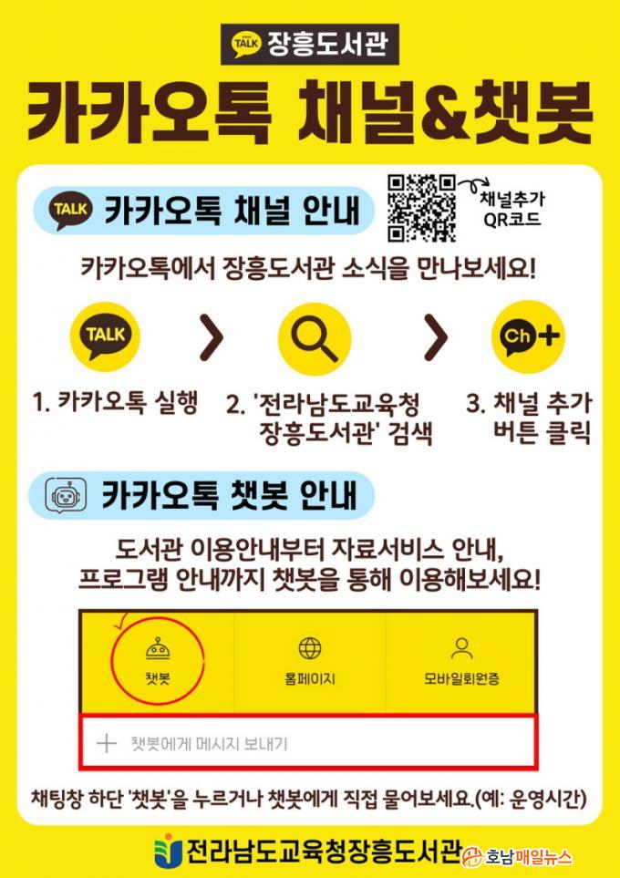 īī¿ÀÅå ä³Î ÀÌ¿ë ¹æ¹ýÀ¸·Î´Â īī¿ÀÅå Ä£±¸ °Ë»öâ¿¡ ¡®Àü¶ó³²µµ±³À°Ã»ÀåÈïµµ¼°ü¡¯À» °Ë»öÇϰųª È«º¸¹°ÀÇ QRÄڵ带 ½ºÄµÇÏ¿© ä³Î Ãß°¡¸¦ Çϸé ÀåÈïµµ¼°üÀÇ ÃֽŠ¼Ò½ÄÀ» ¹Þ¾Æº¼ ¼ö ÀÖ´Ù.