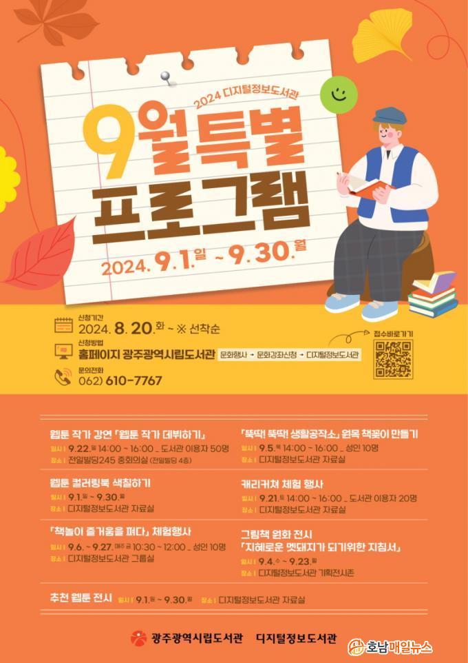 Çà»ç ÀÏÁ¤°ú Âü¿© ½ÅûÀº ±¤Áֽø³µµ¼°ü ´©¸®Áý(https://citylib.gwangju.kr/)¿¡¼ È®ÀÎ °¡´ÉÇÏ´Ù. ÀÚ¼¼ÇÑ »çÇ×Àº »çÁ÷µµ¼°ü(062-613-7772), »ê¼öµµ¼°ü(062-613-7814), µðÁöÅÐÁ¤º¸µµ¼°ü(062-613-7767)·Î ¹®ÀÇÇÏ¸é µÈ´Ù.
