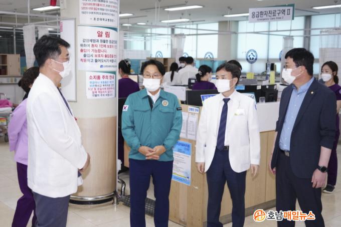 ° ½ÃÀåÀº À̳¯ ±èÁøÈ£ Á¶¼±´ëÇб³º´¿øÀå µî°ú ÇÔ²² ±Ç¿ªÀÀ±ÞÀÇ·á¼¾ÅÍ ¿î¿µ»óȲ, ÀÀ±ÞȯÀÚ¼ö¿ë ÇöȲ ¹× ´ëÃ¥À» ÇÔ²² ³íÀÇÇß´Ù. ¶Ç Ãß¼® ¿¬ÈÞ¸¦ ¾ÕµÎ°í ÀÀ±Þ½Ç °úºÎÇÏ¿¡ ´ëÇÑ ½Ã¹ÎµéÀÇ °ÆÁ¤ÀÌ Å« ¸¸Å Â÷Áú ¾ø´Â ¿î¿µ¿¡ ¸¸ÀüÀ» ±âÇØÁÙ °ÍÀ» ´çºÎÇß´Ù. Á¶¼±´ëº´¿øÀº ÇöÀç ±âÁ¸ ÀÇ»ç Á¤¿øÀÌ Àý¹ÝÀ¸·Î ÁÙ¾îµç »óȲ¿¡¼µµ ±Ç¿ªÀÀ±ÞÀÇ·á¼¾ÅÍ Á¤»ó¿î¿µÀ» À¯ÁöÇϱâ À§ÇØ ÃÖ¼±À» ´ÙÇϰí ÀÖ´Ù.