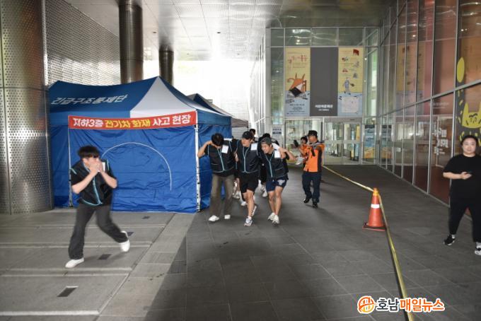 À̳¯ ÁøÇàµÈ ÈÆ·ÃÀº ´ÙÁß ¹ÐÁý ½Ã¼³ ´ëÇüÈÀç »ç°í ¹ß»ý ½Ã ÇöÀå ÅëÇÕÁöÈÖ ¿ª·® °È¿Í °ü°è±â°ü°ú Çù¾÷ ü°è¸¦ Á¡°ËÇØ Àç³ ½ÇÀü ´ëÀÀ ´É·ÂÀ» È®º¸ÇÏ´Â »ó½Ã ÈÆ·ÃÀÌ´Ù. ÀÌ´Â Ãֱ٠Ÿ Áö¿ª¿¡¼ ¹ß»ýÇÑ ÁöÇÏ ÁÖÂ÷Àå ³» Àü±âÂ÷ ÃæÀü¼Ò ÈÀç »ç°í¸¦ °è±â·Î ¿¹¹æ Â÷¿ø¿¡¼ ¸¶·ÃµÆ´Ù.