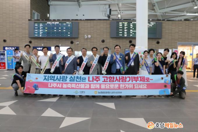 À̳¯ À±º´Å ³ªÁÖ½ÃÀå°ú ³óÇùÁß¾Óȸ ³ªÁÖ½ÃÁöºÎ ½Å°æÈÆ ÁöºÎÀåÀ» ºñ·ÔÇÑ Áö¿ª ³óÇù °ü°èÀÚµéÀÌ Âü¼®ÇØ ³ªÁÖ ½Ò°ú ¹èÁóÀÌ ´ã±ä ¼±¹° ²Ù·¯¹Ì¸¦ ±Í¼º°´µé¿¡°Ô ³ª´²ÁÖ¸é¼ °íÇâ»ç¶û±âºÎÁ¦ÀÇ ÃëÁö¿Í ÇýÅÃÀ» ¾Ë·È´Ù.