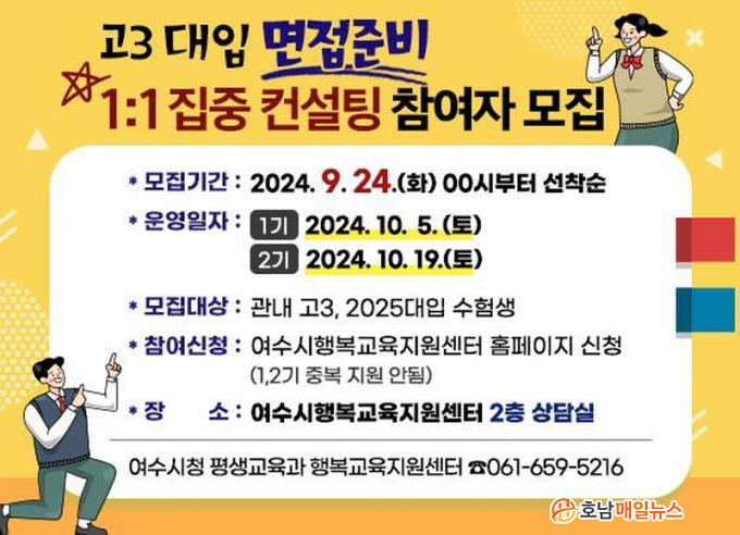 ¸ðÁýÀοøÀº ÃÑ 200¸íÀ¸·Î, ¿©¼ö½ÃÇູ±³À°Áö¿ø¼¾ÅÍ ÁøÇÐ »ó´ã½Ç¿¡¼ ¿À´Â 10¿ù 5Àϰú 10¿ù 19ÀÏ 2ȸ¿¡ °ÉÃÄ ÁøÇàÇÑ´Ù. À̹ø »ó´ãÀº ¼¿ï µîÁöÀÇ Àü¹® »ó´ã°¡¿Í 60ºÐ°£ ÁøÇàµÇ¸ç, Âü¿©ÀÚ°¡ »çÀü¿¡ Á¦ÃâÇÑ ÀڷḦ Åä´ë·Î °³ÀÎ ¸ÂÃãÇü »ó´ãÀÌ ÀÌ·ïÁú ¿¹Á¤ÀÌ´Ù.