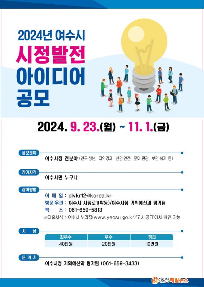 ¿©¼ö½Ã ¹ßÀü¿¡ °ü½É ÀÖ´Â ½Ã¹ÎÀ̶ó¸é ´©±¸³ª Âü¿©ÇÒ ¼ö ÀÖ´Ù. Âü¿©Èñ¸ÁÀÚ´Â ¿À´Â 11¿ù 1ÀϱîÁö ¿©¼ö½Ã ´©¸®Áý(www.yeosu.go.kr) °í½Ã¡¤°ø°í¸¦ Âü°íÇØ ÀüÀÚ¿ìÆí(dlvkr12@korea.kr) ¶Ç´Â ÆÑ½º(061-659-5813), ¹æ¹®, ¿ìÆí µîÀ¸·Î Á¦¾È¼¸¦ ºñ·ÔÇÑ ±¸ºñ¼·ù¸¦ Á¦ÃâÇÏ¸é µÈ´Ù.