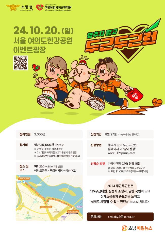 ¸¶¶óÅæ ÄÚ½º´Â ÃÑ 9km·Î 1km¸¶´Ù ½ÉÆó¼Ò»ý¼ú ´Ü°è¸¦ ÇнÀÇÒ ¼ö ÀÖ´Â ÆÝ·±(FUN RUN)ÀÇ Çü½ÄÀ¸·Î ÁøÇàµÇ¸ç ÀÚ¼¼ÇÑ ÀÏÁ¤Àº QRÄÚµå ¹× µÎ±ÙµÎ±Ù·± °ø½ÄȨÆäÀÌÁö(https://www.119cprrun.com/)¿¡¼ È®ÀÎ °¡´ÉÇÏ´Ù.