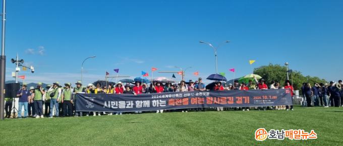 °È±âÇà»ç´Â ´ëÁß±³Åë°ú ÀÚÀü°Å, µµº¸·Î ¿Àõ±×¸°±¤ÀåÀ» Ãâ¹ßÇØ Áß°£ Áý°áÁöÀÎ ½ºÄ«ÀÌÅ¥ºê ¼øÃµ¹®Çаü¿ª±îÁö À̵¿ÇÑ ÈÄ ¸¶Áö¸·À¸·Î ¼øÃµ¸¸½ÀÁö±îÁö ¼¼°èÀÚ¿¬À¯»ê ¼øÃµ°¹¹ú ±æÀ» °É¾ú´Ù. ÃÖÁ¾ ¸ñÀûÁöÀÎ ¼øÃµ¸¸½ÀÁö ¹«Áø±³¿¡¼´Â °È±â Âü°¡ÀÚ¸¦ ȯ¿µÇÏ´Â ¸ÂÀÌ Çà»ç¿Í ÃàÀü ½½·Î°Ç Æîħ ±â³äÇà»ç°¡ ÁøÇàµÆ´Ù.