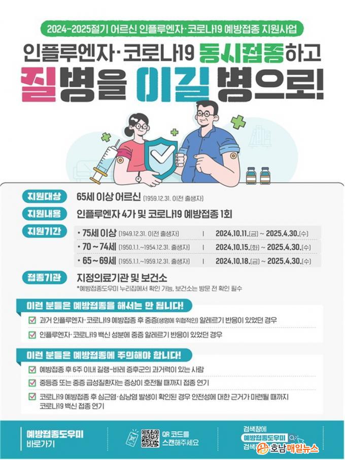 Á¢Á¾ ±â°£Àº 10¿ù11ÀϺÎÅÍ ³»³â 4¿ù30ÀϱîÁö·Î 65¼¼ ÀÌ»ó °í·ÉÃþÀÇ °æ¿ì ÇÑ ¹øÀÇ ÀÇ·á±â°ü ¹æ¹®À» ÅëÇØ Äڷγª19¿Í ÀÎÇ÷翣ÀÚ ¹é½ÅÀ» µ¿½Ã Á¢Á¾ÇÒ ¼ö ÀÖµµ·Ï ¿¬·Éº° Á¢Á¾ ½Ã±â¸¦ ÅëÀÏÇß´Ù. ¡ã75¼¼ ÀÌ»ó °í·ÉÃþÀº 11ÀϺÎÅÍ ¡ã70~74¼¼ °í·ÉÃþÀº 15ÀϺÎÅÍ ¡ã65~69¼¼ °í·ÉÃþÀº 19ÀϺÎÅÍ Á¢Á¾ °¡´ÉÇÏ´Ù. µ¿½Ã Á¢Á¾ÇÒ °æ¿ì Äڷγª19¿Í ÀÎÇ÷翣ÀÚÀÇ Á¢Á¾ ºÎÀ§¸¦ ´Þ¸®ÇØ ¹Þ´Â´Ù.