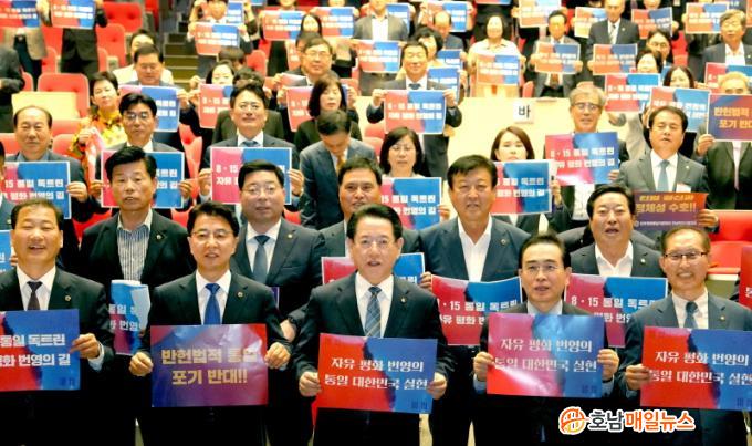 À̳¯ ȸÀÇ¿¡¼ Àü³²Áö¿ª ÀÚ¹®À§¿øµéÀº ±¹¹Î°ú ÇÔ²²ÇÏ´Â ÀÚÀ¯¹ÎÁÖÁÖÀÇ ±â¹Ý ÅëÀÏ Áغñ¿Í ¡®8¡¤15 ÅëÀÏ µ¶Æ®¸°¡¯ ½ÇÇöÀ» À§ÇÑ ÀÇÁö¸¦ °áÁýÇÏ´Â ¡®ÀÚÀ¯ ÆòÈ ¹ø¿µÀÇ ÅëÀÏ ´ëÇѹα¹À» À§ÇÑ °áÀǹ®¡¯À» äÅÃÇß´Ù.