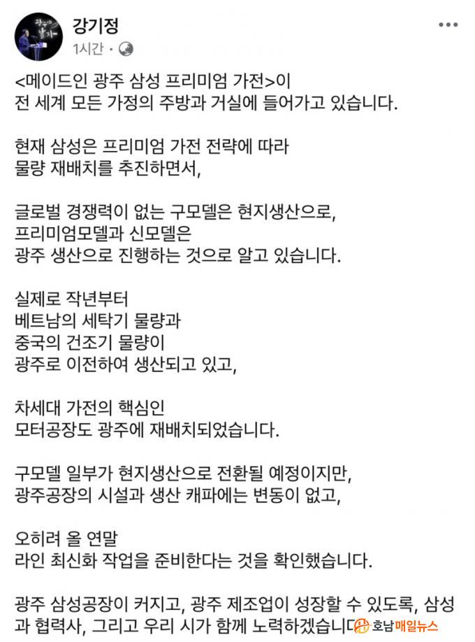 ÇÑÆí, °±âÁ¤ ±¤ÁÖ½ÃÀåÀº À̳¯ »çȸ°ü°è¸Á¼ºñ½º(SNS)ÀÎ ÆäÀ̽ººÏ¿¡ ¡°»ï¼ºÀüÀÚ ±¤ÁÖ»ç¾÷ÀåÀÌ Ä¿Áö°í, ±¤ÁÖ Á¦Á¶¾÷ÀÌ ¼ºÀåÇÒ ¼ö ÀÖµµ·Ï »ï¼ºÀüÀÚ¿Í Çù·Â»ç, ±×¸®°í ±¤Áֽð¡ ÇÔ²² ³ë·ÂÇØ ³ª°¥ °Í¡±À̶ó¸ç ¡°¸ÞÀ̵åÀÎ ±¤ÁÖ »ï¼º ÇÁ¸®¹Ì¾ö °¡ÀüÀÌ ±Û·Î¹ú °æÀï·ÂÀ» °®Ãç Àü ¼¼°è ¸ðµç °¡Á¤ÀÇ ÁÖ¹æ°ú °Å½Ç¿¡ µé¾î°¥ ¼ö ÀÖµµ·Ï Àû±Ø Çù·ÂÇϰڴ١±°í ÀüÇß´Ù.