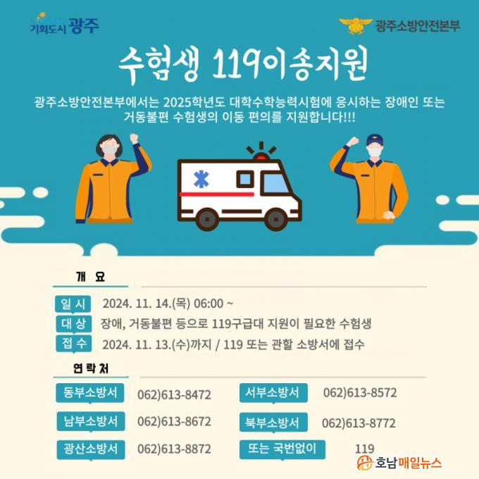 ¡®119 ÀÌ¼Û ¼ºñ½º¡¯´Â Àå¾Ö³ª »ç°íºÎ»ó µîÀ¸·Î °Åµ¿ÀÌ ºÒÆíÇÑ ¼öÇè»ýÀ» ´ë»óÀ¸·Î ÀüÈ¿¹¾àÀ» ¹Þ¾Æ ½ÃÇè ´çÀÏ 119±¸±ÞÂ÷·Î ÀÚÅÿ¡¼ ½ÃÇèÀå±îÁö ¼öÇè»ýÀ» µ¥·Á´ÙÁÖ°í, ½ÃÇèÀÌ ³¡³ µÚ ´Ù½Ã ÀÚÅñîÁö À̼ÛÇØÁÖ´Â ¼ºñ½º´Ù.