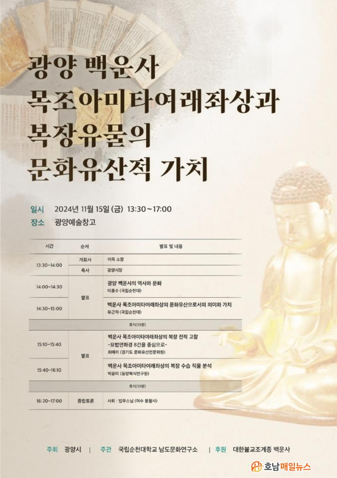 ÀÌ¿¡ ±¤¾ç½Ã¿Í ±¹¸³¼øÃµ´ëÇб³ ³²µµ¹®È¿¬±¸¼Ò(¼ÒÀå ÀÌ¿í)´Â µµÁöÁ¤ ¹®ÈÀ¯»êÀ» º¸¹°·Î ½Â°Ý½Ã۱â À§ÇØ ºÒ±³»ç, ºÒ±³¹Ì¼ú, ¼Áö, º¹½Ä µîÀÇ Àü¹®°¡¸¦ ÃʺùÇØ ¹é¿î»ç ¸ñÁ¶¾Æ¹ÌŸ¿©·¡Á»ó ¹× º¹ÀåÀ¯¹°ÀÇ ¹®ÈÀ¯»êÀû °¡Ä¡ ¿¬±¸ °á°ú¸¦ ¹ßÇ¥ÇÏ´Â ÀÚ¸®¸¦ ¸¶·ÃÇß´Ù.