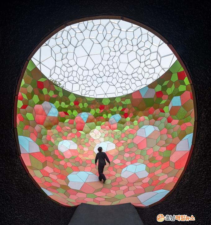 ÀÛǰÀº Á÷°æ 8mÀÇ °ø¸ð¾ç ±¸Á¶¹°·Î ÀÔ±¸´Â ¾îµÎ¿î µ¿±¼Ã³·³ ¸¸µé¾ú´Ù. ¾îµÎ¿î Åë·Î¸¦ Åë°úÇϸé ÀÛǰÀÇ ³»ºÎ¿Í ¸Â´Ú¶ß¸°´Ù. ³»ºÎ¿¡´Â ¼¼°è 3´ë ¿ë¾Ï¼® ŸÀÏ »êÁö Áß ÀÌÅ»¸®¾Æ»ê ¿ë¾Ï¼® ŸÀÏ·Î ºÓÀº»ö°ú ³ì»öÀÌ Á¤±³ÇÏ°Ô ±¸¼ºµÇ¾î Âù¶õÇÑ ÇÞºûÀ» ¹Ý»çÇϸç ÀÔü°¨À» ¿¬Ãâ, »õ·Î¿î ½Ã°¢Àû È¿°ú¸¦ ¸¸µé¾î³½´Ù.