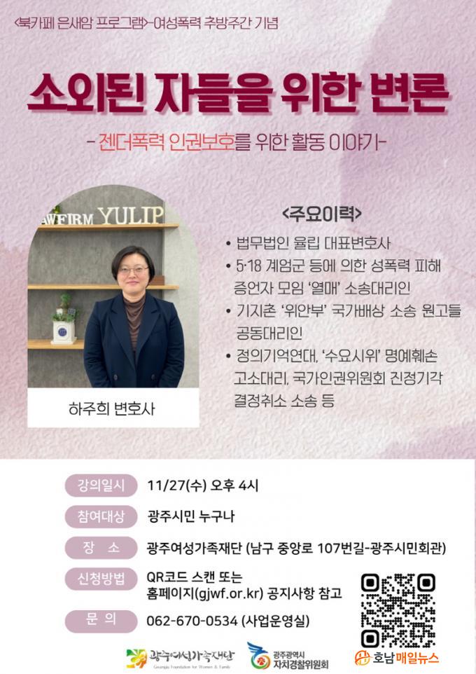 °¿¬ÀÚ ÇÏÁÖÈñ º¯È£»ç´Â ¡ã¡®¿¸Å¡¯(5¡¤18 °è¾ö±º µî¿¡ ÀÇÇÑ ¼ºÆø·Â ÇÇÇØ Áõ¾ðÀÚ ¸ðÀÓ) ¼Ò¼Û´ë¸®ÀÎ ¡ã±âÁöÃÌ À§¾ÈºÎ ±¹°¡¹è»ó ¼Ò¼Û ¿ø°í °øµ¿´ë¸®ÀÎ ¡ãÁ¤ÀDZâ¾ï¿¬´ë ¼Ò¼Û´ë¸®ÀÎ µî ÀαǺ¸È£ Ȱµ¿ ÇöÀå¿¡¼ÀÇ »ý»ýÇÑ °æÇèÀ» ¹ÙÅÁÀ¸·Î ¿©¼º¿¡ ´ëÇÑ ±¸Á¶Àû Æø·Â¿¡ ´ëÇÑ °í¹Î°ú ¼Ò¿ÜµÈ ÀÚµéÀÇ À뱂 ½ÇÇöÀ» À§ÇÑ ¹æ¾È µî¿¡ ´ëÇØ °¿¬À» ÆîÄ¥ ¿¹Á¤ÀÌ´Ù.