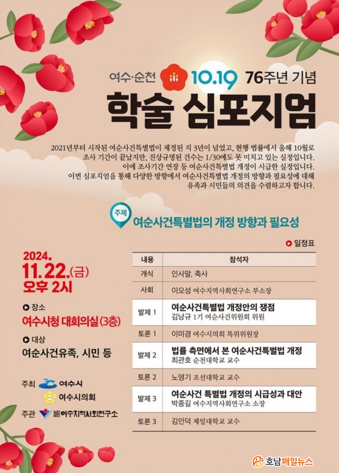 ¿©¼ö½Ã°¡ ÁÖÃÖÇϰí (»ç)¿©¼öÁö¿ª»çȸ¿¬±¸¼Ò°¡ ÁÖ°üÇÏ´Â À̹ø Çà»ç´Â ¿©¼ø»ç°Ç Ưº°¹ý Á¦Á¤ ÀÌÈÄ 3³â°£ÀÇ º¯È¸¦ µ¹¾Æº¸°í Çö½ÇŸ¦ Áø´ÜÇÏ¿© ÇâÈÄ Æ¯º°¹ý °³Á¤ ¹æÇâ¿¡ ´ëÇØ ³íÀÇÇÏ´Â ½Ã°£À» °®±â À§ÇØ ¸¶·ÃµÆ´Ù.