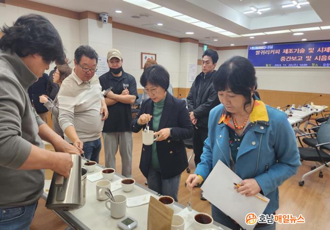 À̹ø º¸°íȸ´Â À̺´Ã¶ ºÎ±º¼ö¸¦ ºñ·ÔÇØ Ä¿ÇÇ Àü¹®°¡, °ü³» Ä¿ÇÇ ÆÇ¸Å¾÷¼Ò 5°³¼Ò, °ø¹«¿ø µî 10¿©¸íÀÌ Âü¼®ÇÑ °¡¿îµ¥ °ÁøÀÇ ´ëÇ¥ Ư»ê¹°ÀÎ ½Ò±Í¸®¸¦ Ȱ¿ëÇÑ Ä¿ÇÇ 2Á¾(µå¸³¹é, Äݵåºê·ç) °³¹ß ¿ë¿ªÀÇ ÁøÇà»óȲ¿¡ ´ëÇØ ÀÚ¼¼ÇÑ ¼³¸íÀ» µè°í ½ÃÀ½È¸¸¦ ÅëÇØ ¸À, Çâ¿¡ ´ëÇÑ °ü´É Æò°¡¿Í °³¼±»çÇ׿¡ ´ëÇÑ ÀǰßÀ» ¼ö·ÅÇß´Ù.