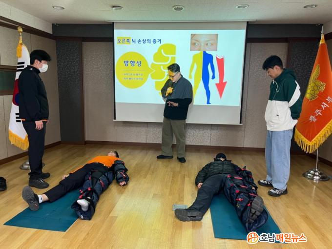 ±¤ÁÖ¼Ò¹æ¾ÈÀüº»ºÎ¿¡´Â ÇöÀç 12¸íÀÇ 119³úÁ¹Áß °»ç°¡ Ȱµ¿Çϸç, ±¸±Þ´ë¿ø ´ë»ó ½É³úÇ÷°üÁúȯÀÚ¿¡ ´ëÇÑ ÀÀ±Þóġ µî ±³À°À» Çϰí ÀÖ´Ù.