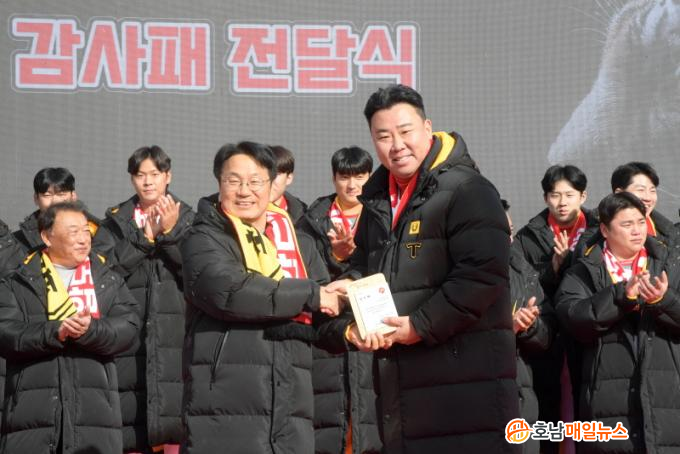 °±âÁ¤ ±¤ÁÖ½ÃÀåÀº ¡°ÇѰ ÀÛ°¡ ³ëº§¹®Çлó ¼ö»ó µî ±¤ÁÖ¿¡ ±â»Û ÀÏÀÌ °è¼ÓµÇ°í ÀÖ´Â °¡¿îµ¥ KIA ŸÀ̰ÅÁî Çѱ¹½Ã¸®Áî ¿ì½ÂÀº ¡®±¤ÁÖÀÇ Èû¡¯ÀÌ´Ù¡±¸ç ¡°¼±¼ö °³ÀÎÀÇ ¿µ±¤À» ³Ñ¾î ±¤ÁÖÀÇ Àü¹ÝÀûÀÎ ¿¡³ÊÁö¸¦ ²ø¾î¿Ã¸®°í Ȱ·ÂÀ» ´õÇß´Ù. ³»³â¿¡µµ ±¤Áֽùεé°ú ÇÔ²² ¶ß°Ì°Ô ÀÀ¿øÇϰڴ١±°í ¹àÇû´Ù.