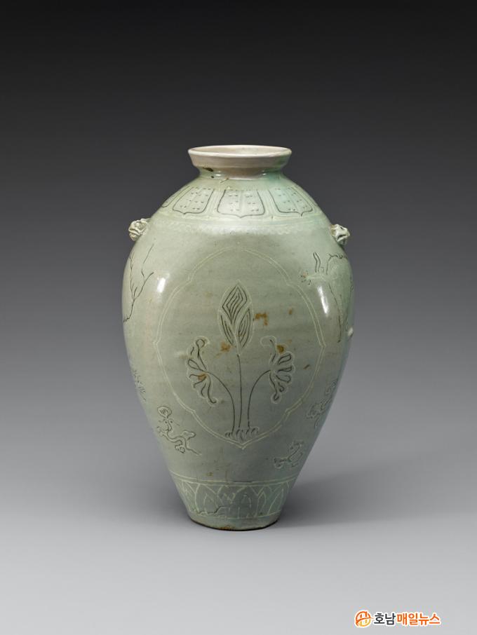 °í·Á Á߱⿡ Á¦ÀÛµÈ ¸Åº´ÀÇ ÇüÅÂ¿Í ¹®¾çÀ» Àß º¸¿©ÁÖ´Â À¯¹°ÀÌ´Ù. ¸Åº´ ÇüŰ¡ ¹Ù´Ú¿¡¼ µÕ±Ù ¾î±ú±îÁö °ÅÀÇ Á÷¼±¿¡ °¡±õ°Ô À̾îÁö°í, ¸öü¿¡ ºñÇØ ±¸¿¬ÀÌ ¸Å¿ì Á¼°í ÀÛÀº °ÍÀÌ Æ¯Â¡ÀÌ´Ù. ÀüüÀûÀ¸·Î À¯¾àÀÌ ³ì°¥»öÀ» ¶ì±â´Â ÇÏÁö¸¸, ¹®¾çÀÇ ½Ã¹® »óųª ¼ºÇü »óÅ´ ¿Õ½Ç ¼Ò¿ëÀÇ Ã»ÀÚ¿´À» °ÍÀ¸·Î ÃßÁ¤µÈ´Ù. ¸öü Àü¸é¿¡ ¸ð¶õ ³ÕÄðÀ» ¹èÄ¡Çϰí, ³ÕÄð »çÀÌ¿¡ ±ä ²¿¸®¸¦ ´Ã¾î¶ß¸®¸ç ³¯°í ÀÖ´Â ¾Þ¹«¸¦ »õ°å´Ù.