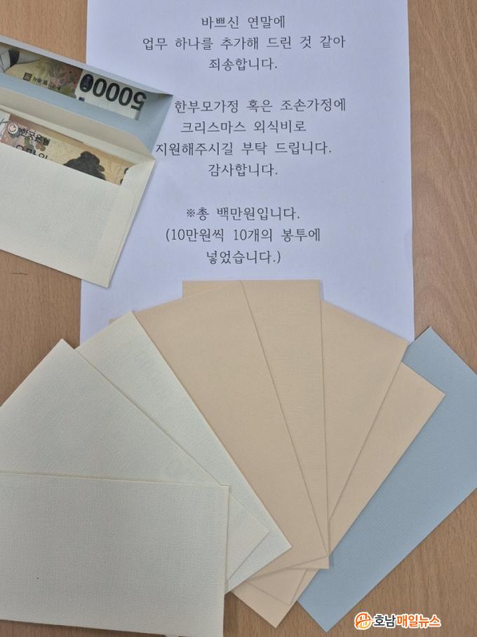 ÆíÁö¿¡´Â ¡°ÇѺθð ¹× Á¶¼Õ°¡Á·¿¡ Å©¸®½º¸¶½º ¿Ü½Äºñ·Î Áö¿øÇØ Áֽñ⸦ ºÎŹÇÑ´Ù¡±´Â ³»¿ëÀÌ ÀûÇô ÀÖ¾úÀ¸¸ç, 10¸¸¿ø¾¿ ´ã¾Æ ¸¸µç ¿¹»Û ºÀÅõ 10°³°¡ ÇÔ²² ´ã°Ü ÀÖ¾ú´Ù.