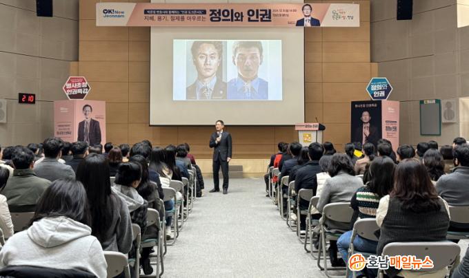 ´ëÇѹα¹À» ´ëÇ¥ÇÏ´Â ÀαǺ¯È£»ç·Î Ȱµ¿ ÁßÀÎ ¹ÚÁØ¿µ º¯È£»ç¸¦ ÃÊÃ»ÇØ, ¡®ÁöÇý, ¿ë±â, ÀýÁ¦¸¦ ¾Æ¿ì¸£´Â Á¤ÀÇ¿Í Àαǡ¯ ÁÖÁ¦ °¿¬À» Çß´Ù. ¿©·¯ »çȸÀû »ç°Ç¿¡¼ Áß¿äÇÑ ¿ªÇÒÀ» ÇØ¿Â °æÇèÀ» ¹ÙÅÁÀ¸·Î ¹ý°ú Á¤ÀÇ, Àαǿ¡ ´ëÇÑ Áø¼ÖÇÑ »ý°¢À» Ç®¾î³»¸ç ÀαÇÀÇ Àǹ̸¦ ´Ù½Ã Çѹø µ¹¾Æº¸´Â ½Ã°£À¸·Î ÁøÇàµÆ´Ù.