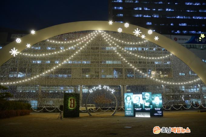 ±¤Áֽô ÇàÁ¤µ¿ ¾Õ ³ôÀÌ 12m, ±æÀÌ 49m Å©±âÀÇ ¾ÆÄ¡Çü ±¸Á¶¹°ÀÎ ¡®ºû°íÀ»¹«Áö°³¡¯¿¡ ¹ß±¤´ÙÀÌ¿Àµå(LED)·Î Á¶¸íÀ» ¼³Ä¡Çϰí, Àü¸éºÎ¿¡´Â ±¤ÁÖ Ãâ½Å ÇѰ ÀÛ°¡ ³ëº§»ó ¼ö»óÀ» ±â³äÇÏ´Â Æ÷ÅäÁ¸À» Á¶¼ºÇß´Ù.