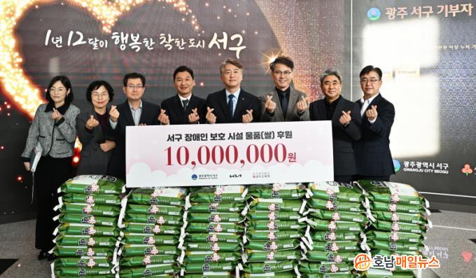 [È£³²¸ÅÀÏ´º½º = ±è¿¬Èñ ±âÀÚ] ±èÀ̰ ±¤ÁÖ ¼±¸Ã»ÀåÀº 10ÀÏ ±â¾Æ ±¤ÁÖÀü³²Áö¿ªº»ºÎ(º»ºÎÀå Á¤±æ¼ö)¿Í ±¤Áֽż¼°è(´ëÇ¥ À̵¿ÈÆ)·ÎºÎÅÍ Àå¾ÖÀÎ º¸È£ ½Ã¼³ Áö¿øÀ» À§ÇÑ ¹é¹Ì10kg 434Æ÷(1õ¸¸¿ø »ó´ç)¸¦ Àü´Þ¹Þ°í °¨»çÀÇ ¸¶À½À» ÀüÇß´Ù.