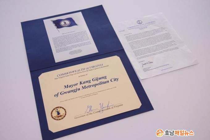 ±¤ÁÖ±¤¿ª½Ã(½ÃÀå °±âÁ¤)´Â ÃÖ±Ù ¹Ì±¹ ¹öÁö´Ï¾ÆÁÖ ±Û·» ¿µÅ²(Glenn Youngkin) ÁÖÁö»ç°¡ Ä£ÇÊ ¼¸íÀÌ ´ã±ä °¨»çÁõ¼¿Í Á¶¼Á ±¸½º¸® ³ó¾÷‧¼ÒºñÀÚ¼ºñ½ººÎ ûÀåÀÇ ¼Çѹ®, ¹öÁö´Ï¾ÆÁֱ⸦ º¸³»¿Ô´Ù°í 3ÀÏ ¹àÇû´Ù.