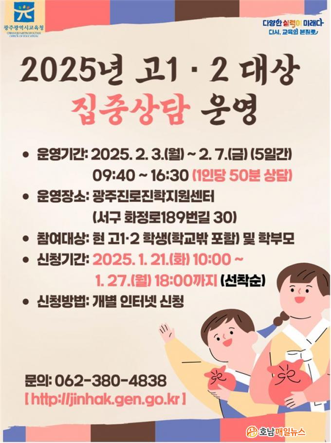 »ó´ãÀ» Èñ¸ÁÇÏ´Â ÇлýÀº ¿À´Â 21ÀÏ ¿ÀÀü 10½ÃºÎÅÍ 27ÀÏ ¿ÀÈÄ 6½Ã±îÁö ±¤ÁÖÁø·ÎÁøÇÐÁö¿ø¼¾ÅÍ È¨ÆäÀÌÁö(https://jinhak.gen.go.kr)¿¡¼ ½ÅûÇÏ¸é µÈ´Ù.