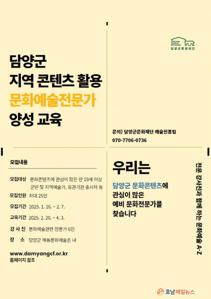 Àç´Ü ¹®È¿¹¼ú Àü¹®°¡ ¾ç¼º °úÁ¤Àº ´ã¾ç±º Áö¿ª ¹®È¸¦ ±â¹ÝÀ¸·Î ¹®È¿¹¼úÀü¹®°¡¸¦ À°¼ºÇϱâ À§ÇÑ ±³À°À¸·Î, 2¿ù 20ÀϺÎÅÍ 4¿ù 3ÀϱîÁö ÃÑ 7ȸÂ÷ °úÁ¤À» ¸ÅÁÖ ¸ñ¿äÀÏ(1¡¤2ȸÂ÷ ¸ñ¡¤±Ý¿äÀÏ) ¿ÀÈÄ 5½Ã¿¡ ÁøÇàÇÑ´Ù.