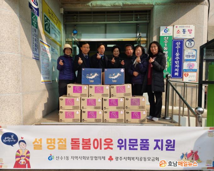 À̳¯ Çà»ç¿¡¼´Â »ê¼ö1µ¿ Áö»çÇù À§¿øµéÀÌ µ¹º½ ÀÌ¿ô¿¡°Ô ÂüÄ¡ ¼±¹° ¼¼Æ®(65¼¼´ë) ¹× ÀüÅë½ÃÀå »óǰ±Ç(3¸¸ ¿ø¡¤33¼¼´ë)À» Àü´ÞÇÏ¸é¼ ¾ÈºÎ¸¦ »ìÇÇ°í µû¶æÇÑ Á¤À» ³ª´©´Â ½Ã°£À» °¡Á³´Ù.