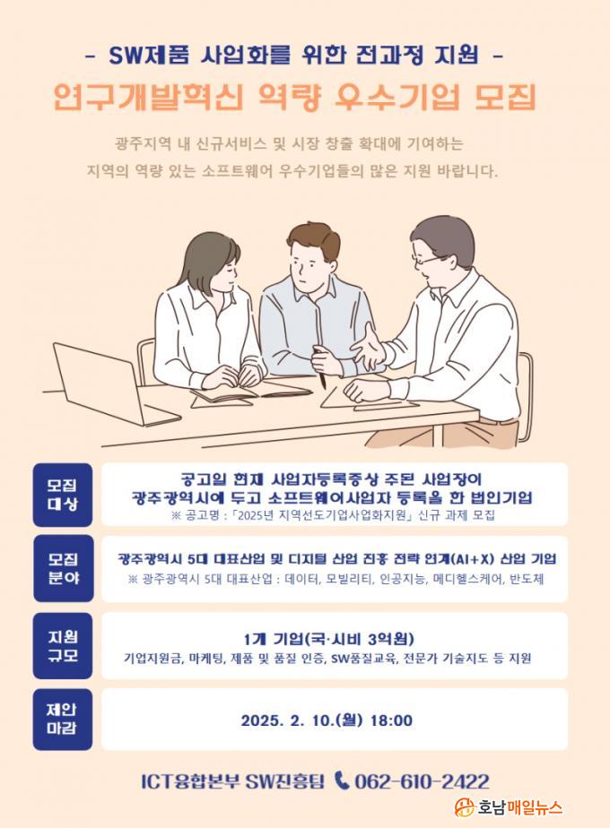 ¸ðÁý ´ë»óÀº °ø°íÀÏ ±âÁØ ±¤Áֽà ¼ÒÀç SW»ç¾÷ÀÚ(ÁÖ »ç¾÷Àå)·Î, ¸ÅÃâ¾× µî ¿¹ºñ¼±µµ±â¾÷ ¼¼ºÎ¿ä°Ç¸¦ ÃæÁ·ÇÑ ±â¾÷ÀÌ´Ù. ±¤Áֽô »ç¾÷¼º Æò°¡¸¦ °ÅÃÄ 1°³ ¼±µµ±â¾÷À» ¼±Á¤ÇØ 3¾ï¿ø(±¹¡¤½Ãºñ)À» Áö¿øÇÑ´Ù.