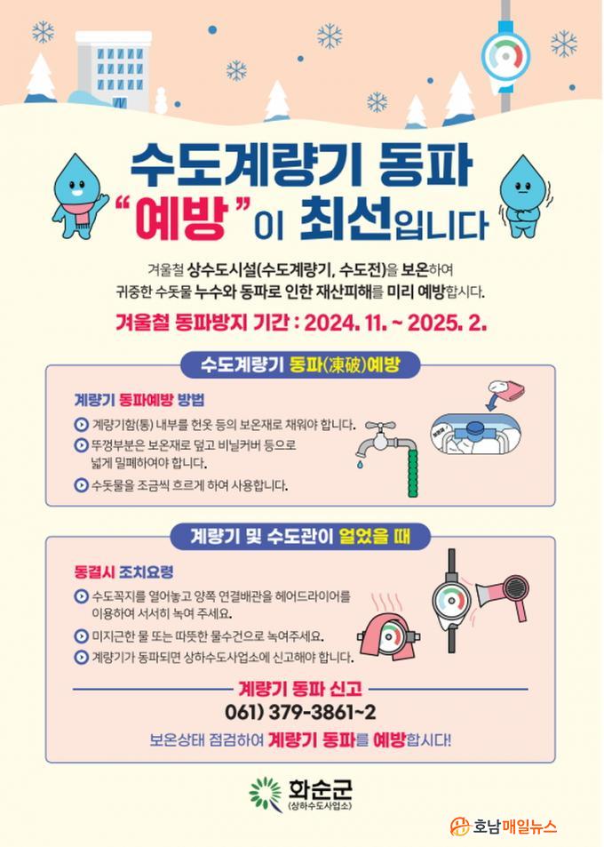 ¹ÚÁ¾¿Á »óÇϼöµµ»ç¾÷¼ÒÀåÀº ¡°°è·®±â µ¿ÆÄ ¿¹¹æÀº °¡Á¤°ú »ç¾÷ü¿¡¼ 1Â÷ ÀûÀ¸·Î Á¶Ä¡ÇÑ´Ù¸é ÃæºÐÈ÷ ¸·À» ¼ö ÀÖÀ¸¸ç, Áö¼ÓµÇ´Â ÇÑÆÄ¿¡ °è·®±â°¡ µ¿ÆÄµÇ¸é ȼø±º »óÇϼöµµ»ç¾÷¼Ò ¹°°ü¸®ÆÀ(¢Ï061-379-3862)À¸·Î ½Å¼ÓÈ÷ ½Å°íÇÏ¿© ÁÖ½Ã±æ ¹Ù¶õ´Ù.¡±¶ó°í ÀüÇß´Ù.
