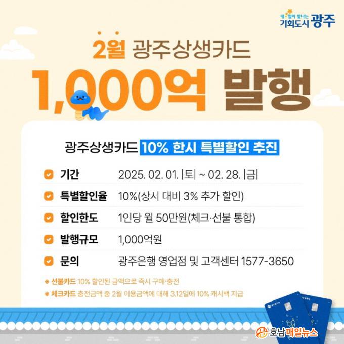 ±¤ÁÖ±¤¿ª½Ã(½ÃÀå °±âÁ¤)´Â ½Ãºñ 100¾ï¿øÀ» ÅõÀÔÇØ 2¿ù ÇÑ ´Þ°£ ±¤ÁÖ»ó»ýÄ«µå 10% Ưº°ÇÒÀÎÀ» ¿¬Àå ½ÃÇàÇÑ´Ù. ±âÁ¸ ±¤ÁÖ»ó»ýÄ«µå ÇÒÀÎÀ²Àº 7%´Ù.