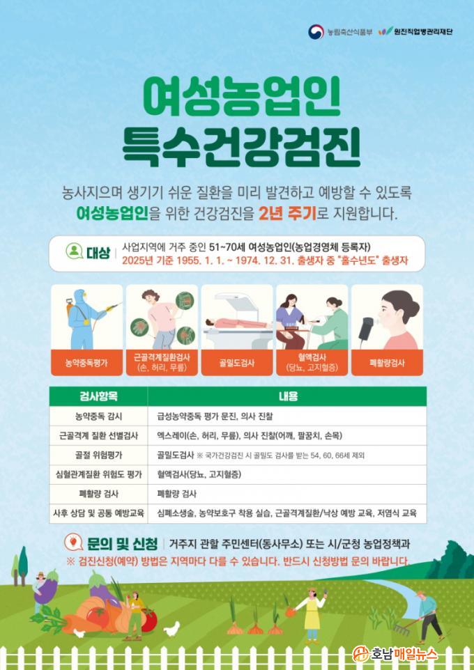 ¿©¼º³ó¾÷ÀΠƯ¼ö°Ç°°ËÁøÀº ÀϹݰǰ°ËÁø°ú ´Þ¸®, ¿©¼º³ó¾÷ÀÎÀÌ Ãë¾àÇÑ ÁúȯÀ» Á¶±â¿¡ ¹ß°ßÇÏ°í ¿¹¹æÇÒ ¼ö ÀÖµµ·Ï ¸¶·ÃµÆ´Ù. °ËÁø Ç׸ñ¿¡´Â ³óÀÛ¾÷À¸·Î ÀÎÇØ ¹ß»ýÇϱ⠽¬¿î ±Ù°ñ°Ý°è, ½ÉÇ÷°ü°è, °ñÀý¡¤¼Õ»ó À§Çèµµ, Æó ±â´É, ³ó¾à Áßµ¶ µî 5°³ ¿µ¿ª, 10°³ Ç׸ñÀÌ Æ÷ÇԵǸç, °ËÁø ÈÄ¿¡´Â »çÈİü¸® ¹× ¿¹¹æÀ» À§ÇÑ ±³À°°ú Àü¹®ÀÇ »ó´ãµµ ÇÔ²² Á¦°øµÈ´Ù.