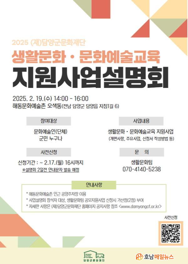 À̹ø ¼³¸íȸ´Â 2025 ´ã¾ç±º¹®ÈÀç´Ü »ýȰ¹®È¡¤¹®È¿¹¼ú±³À°Áö¿ø »ç¾÷¿¡ ´ëÇÑ ¾È³»¿Í ÁÖ¿ä °³Æí»çÇ×, Áö¿øÇ׸ñ, ½Åû ÀýÂ÷ µîÀ» ¼³¸íÇÒ ¿¹Á¤À̸ç, Àç´Ü ȨÆäÀÌÁöwww.damyangcf.or.kr) ½Åû ¸µÅ©¸¦ ÅëÇØ ¿À´Â 17ÀÏ ¿ÀÈÄ 4½Ã±îÁö »çÀü Á¢¼ö °¡´ÉÇÏ´Ù.