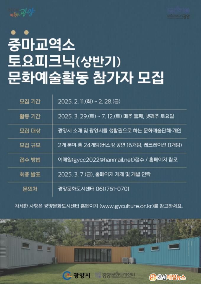 Âü°¡ÀÚ °ø¸ð´Â 2¿ù 11ÀϺÎÅÍ 2¿ù 28ÀϱîÁö À̸ÞÀÏ·Î Âü°¡ÀÚ ½ÅûÀ» ¹Þ°í, ¼·ù½É»ç¸¦ °ÅÃÄ 3¿ù 7ÀÏ¿¡ ÃÖÁ¾ Âü°¡ÆÀÀ» ¹ßÇ¥ÇÒ ¿¹Á¤ÀÌ´Ù. Á¦Ãâ¼·ù µî ÀÚ¼¼ÇÑ ³»¿ëÀº ±¤¾ç¹®Èµµ½Ã¼¾ÅÍ ¿Â¶óÀΠȨÆäÀÌÁö(www.gyculture.or.kr)¿¡¼ È®ÀÎÇÒ ¼ö ÀÖ´Ù.