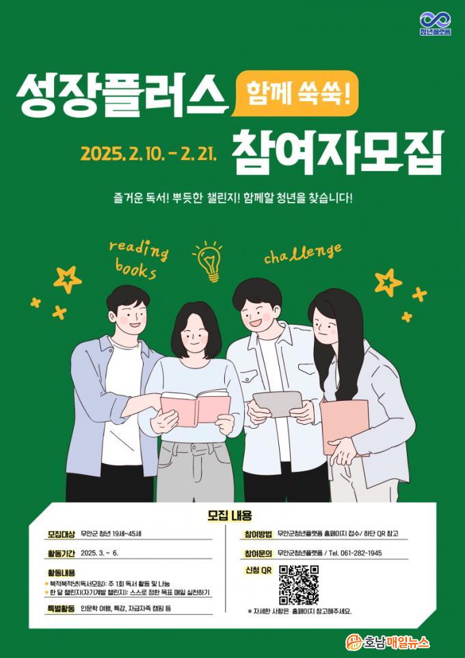 ¡®¼ºÀåÇ÷¯½º¡¯´Â µ¶¼ ¸ðÀÓ(ºÏÀûºÏÀû³Ý)°ú ÀÚ±â°è¹ß 縰Áö(ÇÑ ´Þ 縰Áö) µÎ °¡Áö ÇÁ·Î±×·¥À¸·Î ±¸¼ºµÇ¸ç, ¹«¾È±º¿¡ °ÅÁÖ¡¤ÀçÁ÷¡¤ÀçÇÐ ÁßÀÎ 19¼¼ºÎÅÍ 45¼¼ û³âÀ» ´ë»óÀ¸·Î ÁøÇàµÈ´Ù. ¸ðÁý ÀοøÀº ÃÑ 20¸íÀ¸·Î, µ¶¼ ¸ðÀÓ°ú ÀÚ±â°è¹ß 縰Áö Âü¿©ÀÚ °¢°¢ 10¸í¾¿À̸ç, ¸ðÁý±â°£Àº 2025³â 2¿ù 10ÀϺÎÅÍ 2¿ù 21ÀϱîÁöÀÌ´Ù.